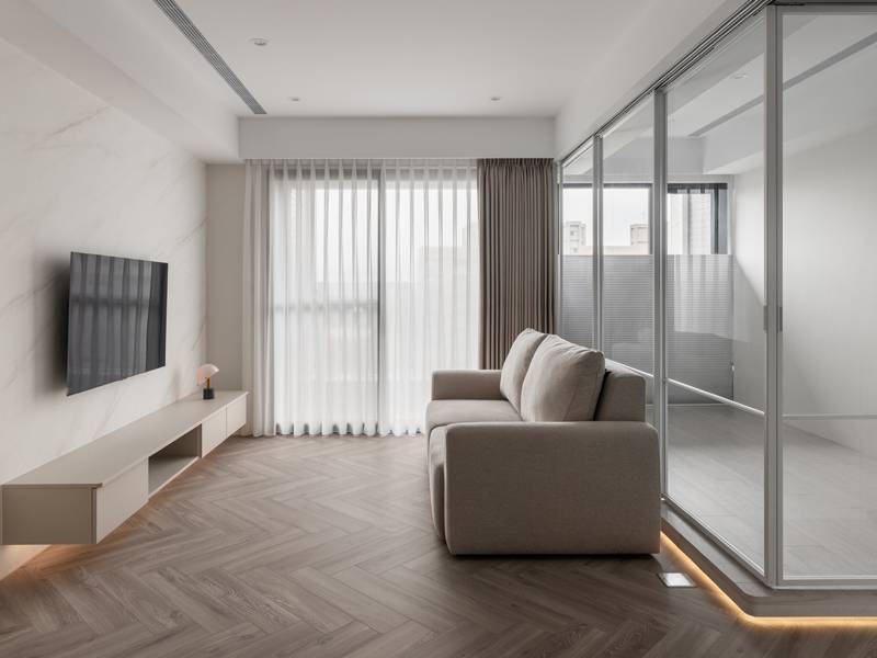 空間設計:餐廳備餐櫃結合收納高櫃,機能性完整。運用人字拼木地板讓豐富整體氛圍。電視牆面運用塗料呈現石材紋路感。主臥運用系統拉門衣櫃,增加空間動線。