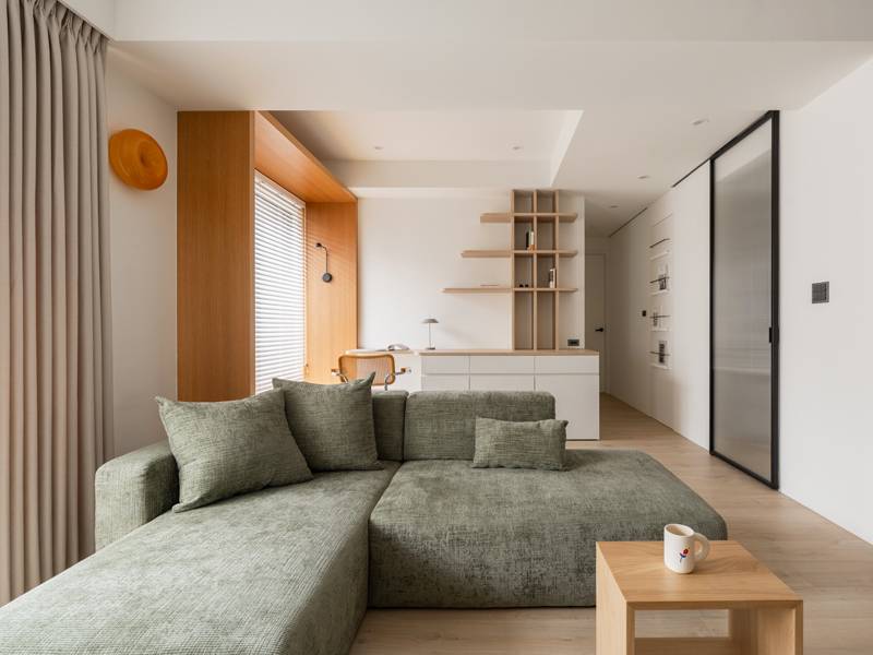 空間設計:玄關櫃以奶油色系搭配,讓空間更為溫馨質約。餐廳與客廳運用系統櫃整體作搭配。開放式書房以木作矮牆區隔,讓視覺更為延展。窗邊臥榻收納櫃讓生活多了嫻靜感。運用日本滑動折門五金,讓衣櫃收納多元化。